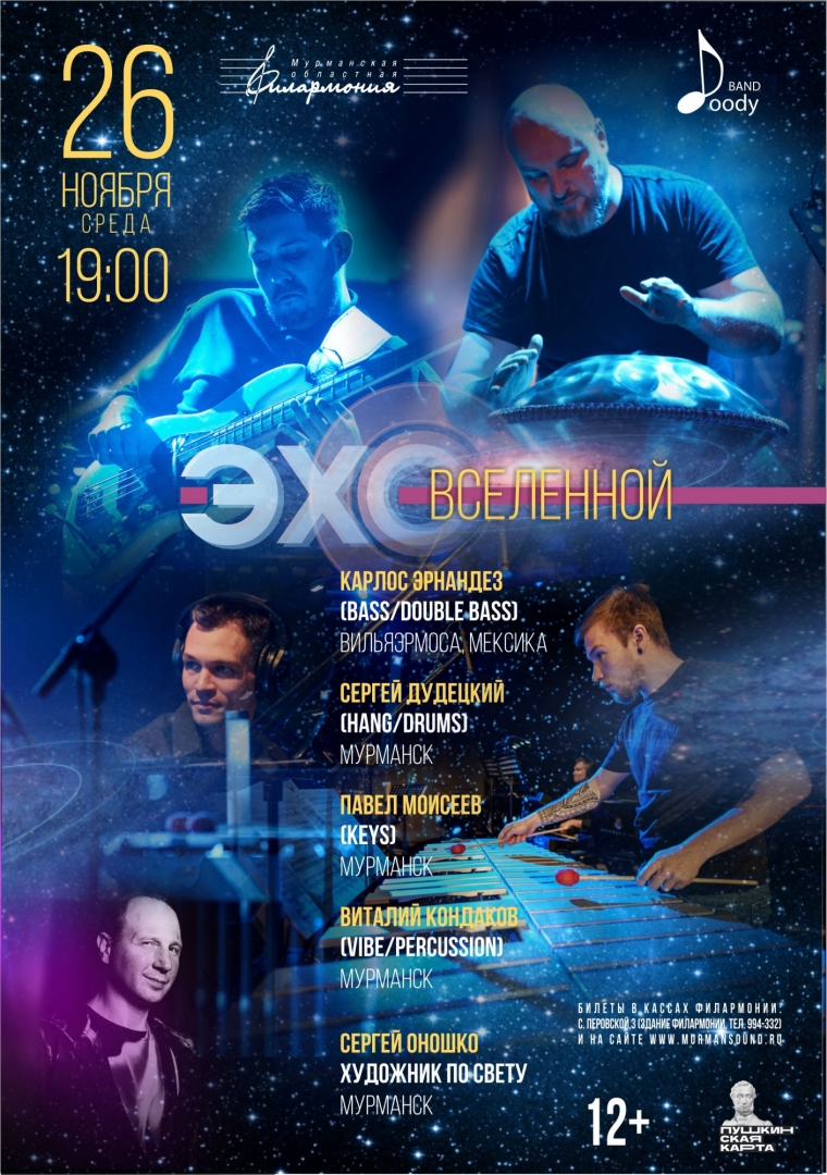 Наиболее яркими и запоминающимися для зрителей оказались два новых проекта Doody Band под названием «Музыка Света» и «Музыка Света. Перезагрузка», где на сцене Большого Зала мурманской филармонии творилась настоящая магия и слияние воедино аудиовизуальной мысли. Именно эти программы дали толчок для создания нового проекта «Эхо Вселенной», которую можно расценивать как завершающую часть трилогии. Благодаря другу и прекрасному музыканту Карлосу Эрнандез, а также новому инструменту в проекте – Хангу – Doody Band выходит в новый космический формат, более красочный, более медитативный, осмысленный и яркий. Ещё больше Ханга, ещё больше погружения. Очень ждём вас».