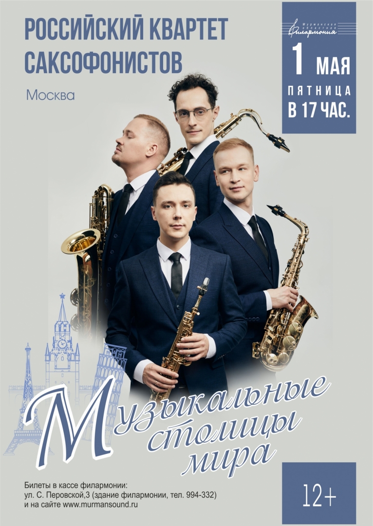 1 мая на сцене Мурманской филармонии блистательный и виртуозный Российский квартет саксофонистов с программой «Музыкальные столицы мира»!