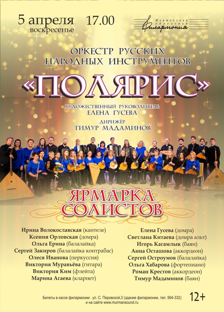 Оркестр "Полярис" уже много лет радует слушателей своими яркими и эмоциональными выступлениями. Коллектив известен своим уникальным стилем исполнения, сочетающим традиции русской народной музыки с современными аранжировками. Концерт «Ярмарка солистов» станет отличным поводом для того, чтобы вновь насладиться мастерством музыкантов и погрузиться в атмосферу настоящего музыкального праздника.