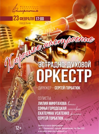 Эстрадно-духовой оркестр. Дирижер и солист - Сергей Горбатюк. Солисты: Софья Городецкая (саксофон), Лилия Мифтахова (вокал), Екатерина Усатенко (флейта). Концертный зал