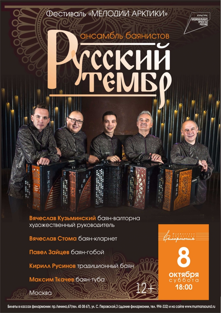 «Виртуозы аккордеонной музыки» – так в Европе называют этот выдающийся ансамбль. «Русский тембр» – это коллектив солистов, где нет и не может быть второстепенных ролей. Но это не мешает музыкантам слышать друг друга, существовать как прочное и неделимое целое, дышать одинаково, представляя ансамбль в самом высоком смысле этого слова.