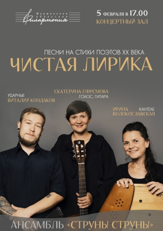 Ансамбль «Струны Струны», в составе которого Екатерина Ефремова (гитара, вокал), Ирина Волокославская (кантеле) и Виталий Кондаков (ударные), только начинает свой творческий путь. Первый концерт нового коллектива состоялся 4 ноября 2021г. и очень понравился слушателям. Привлекает уникальное сочетание инструментов, их гармоничное звучание, искренность и эмоциональность исполнителей, способных, перефразируя Булата Окуджаву, на любовь ваше сердце настроить.