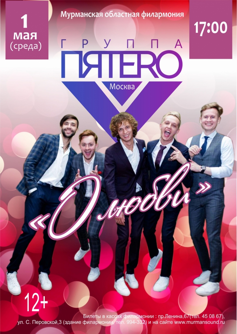 Их ровно пять. Пять парней, которые «делают зал». Вокальная группа «ПЯТЕRO». Только голосами ребята «воспроизводят» звуки гитары, бас-гитары, ударной установки, трубы и других инструментов, Подобный «аккомпанемент» — фирменная фишка группы «ПЯТЕRО». Молодые, стильные, спортивные, сексапильные, азартные, талантливые ребята — недавние выпускники Академии хорового искусства им. В.С. Попова. В репертуаре великолепной пятерки джазовые стандарты и классические арии, популярные народные песни и новогодние мелодии, баллады о любви и зарубежные танцевальные композиции.