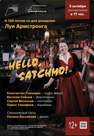 Приближающийся юбилей Луи Армстронга вдохновил группу московских джазменов создать концертную программу «Hello, Satchmo», посвященную всем периодам творчества великого артиста – от «ревущих двацатых» и до самых последних дней жизни Луи. Свои интерпретации музыкальных шедевров, которые в разные годы исполнял «Сачмо», исполнит квартет под руководством трубача и шоумена Константина Гевондяна, а в качестве специального гостя выступит певица Полина Касьянова.