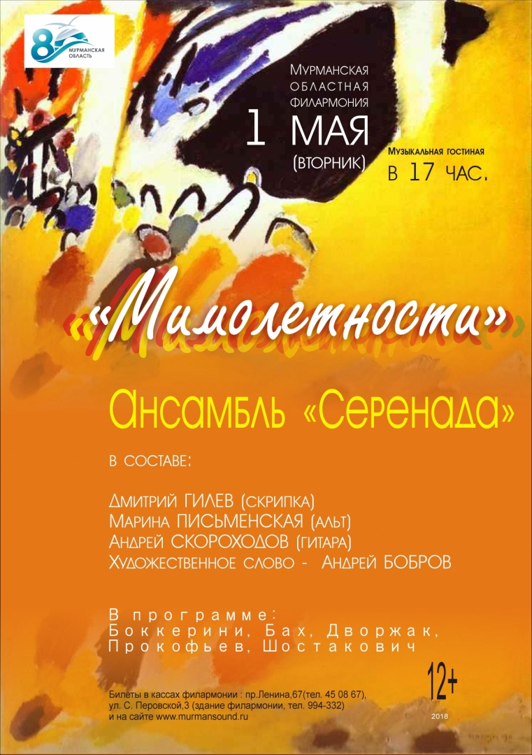 Ансамбль «Серенада» в составе: Дмитрий ГИЛЕВ (скрипка), Марина ПИСЬМЕНСКАЯ (альт), Андрей СКОРОХОДОВ (гитара). Художественное слово – Андрей БОБРОВ.