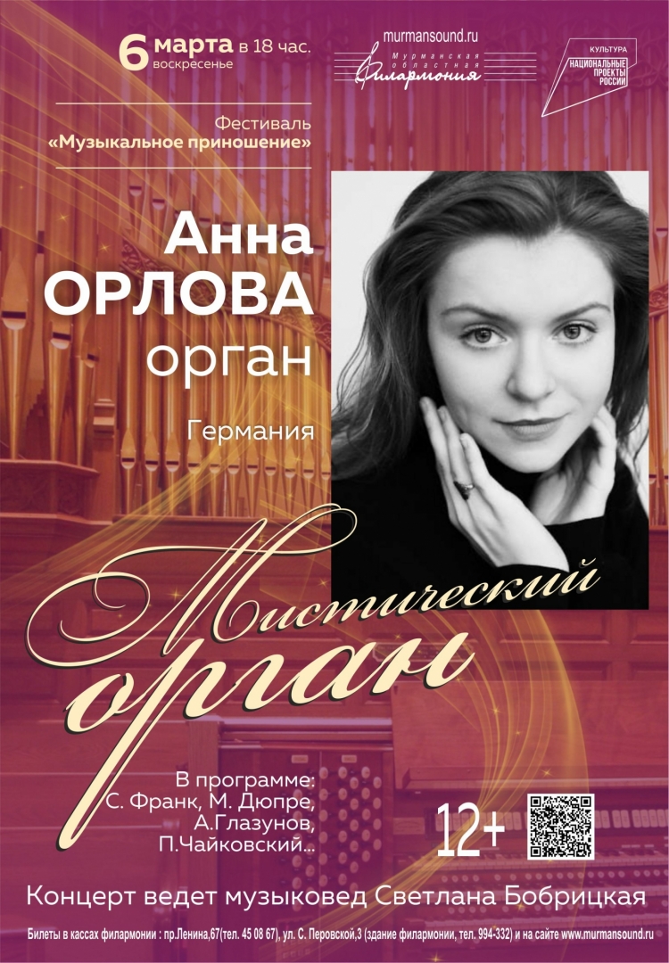 Анна Орлова - московская органистка, выпускница классов Константина Волостнова и Людгера Ломанна. Училась, жила и работала в Германии, в настоящее время оканчивает аспирантуру в Штутгарте. В феврале -марте 2022 года даёт серию концертов в России, в том числе и в Мурманске.