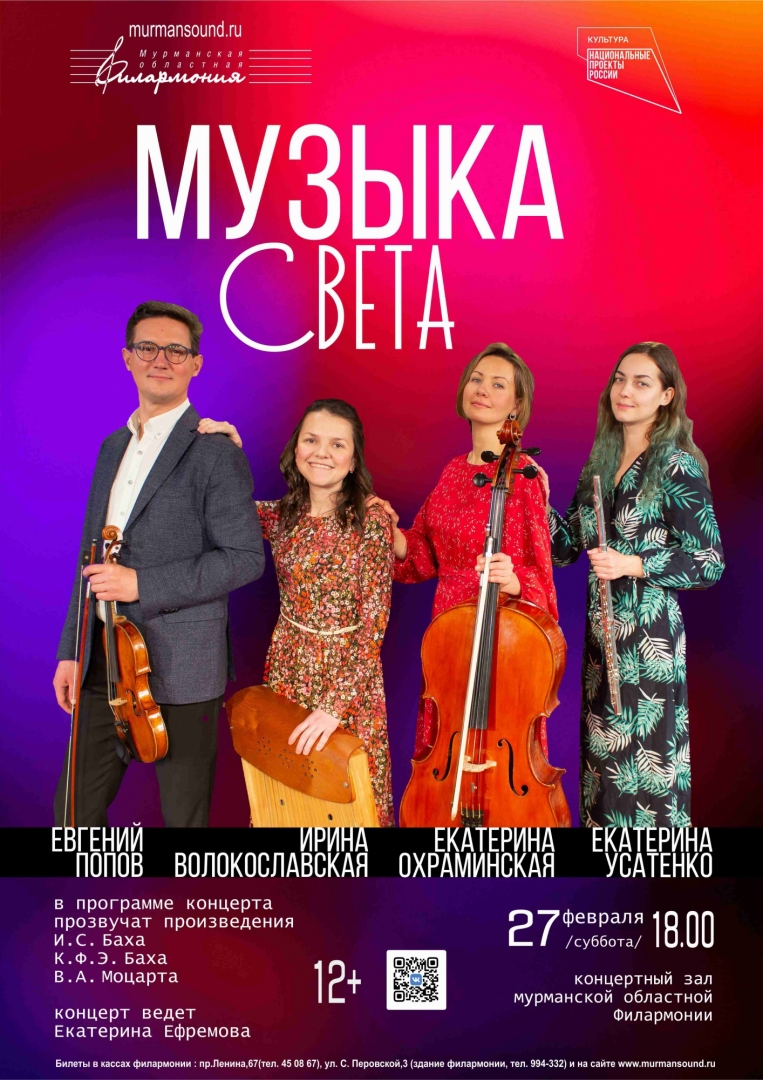Программа состоит из произведений, передающих гармоничное мироощущение композиторов прошлого. Эта музыка вся как бы пронизана светом; она возвышает душу и наполняет её красотой. Состав исполнителей необычен и интересен: в роли солирующего инструмента наряду со скрипкой, флейтой и виолончелью выступает кантеле. Национальный карело - финский инструмент в сочетании с классическими инструментами звучит по - настоящему волшебно. Такого Баха и Моцарта вы ещё не слышали. Подарите себе пропуск в мир прекрасного!