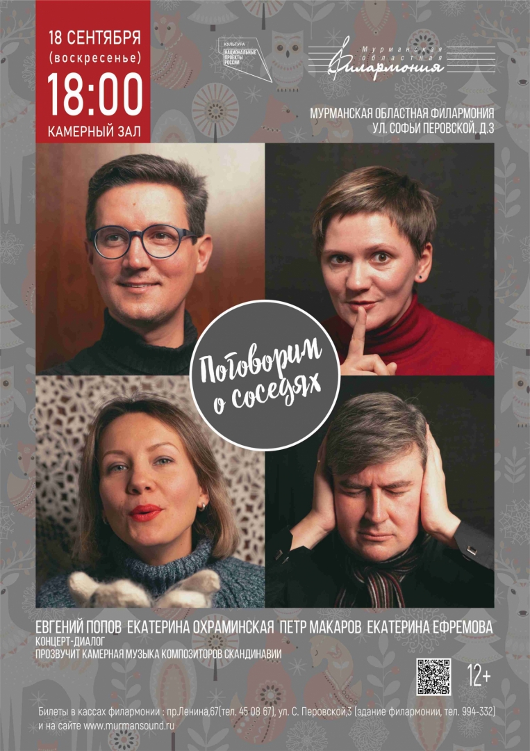 Россия на севере граничит с двумя государствами: Норвегией и Финляндией, и через них - со Швецией. Где же еще говорить о соседях, как не в Мурманской филармонии? Разговор обещает быть увлекательным, наполненным интересными фактами, юмором, наблюдениями и размышлениями о нашей разности и общности. Чтобы лучше понять характер соседей, в программе прозвучит музыка финских, норвежских и шведских композиторов. Вы услышите и всеми любимого Грига, и знаменитого Сибелиуса, и прославленную шведскую женщину-композитора, борца за права женщин Лауру Нетцель, и многих других. Концерт продолжает традицию концертов-диалогов, начатую программой "Поговорим о музыке". У вас будет возможность поделиться вашими историями и поучаствовать в разговоре о наших общих соседях.