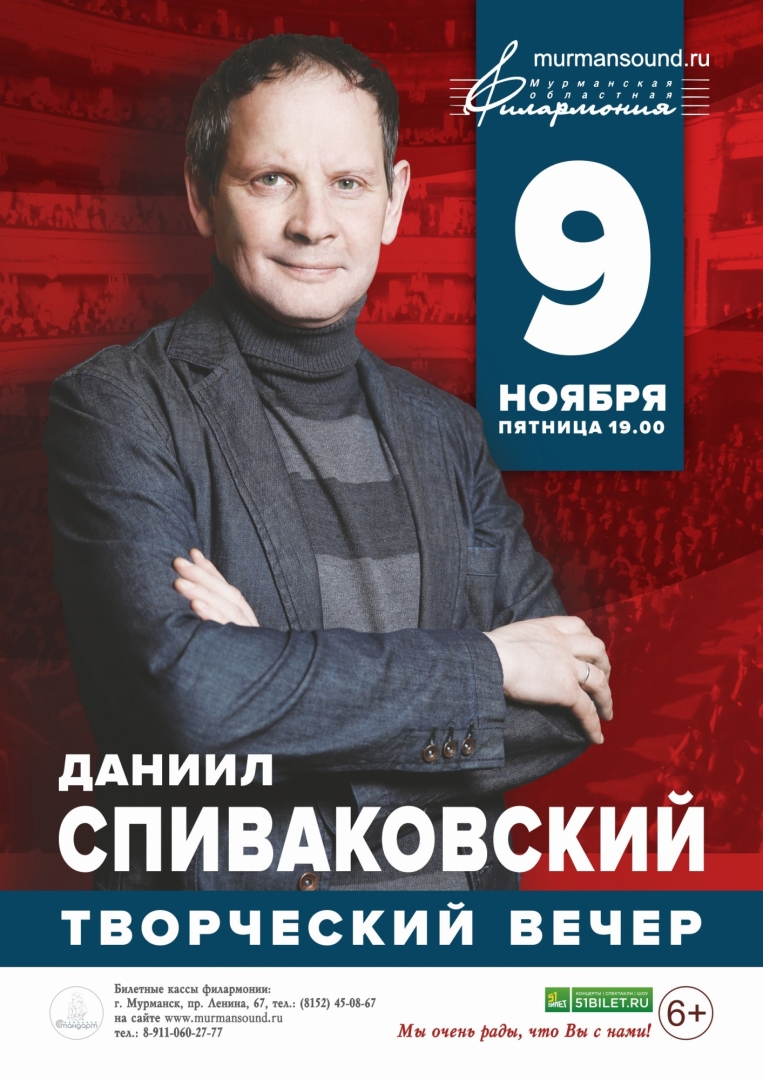 В преддверии юбилея (в 2019 году он отметит 50-летие) Даниил Спиваковский приедет в Мурманск с особой программой. Его многоплановый творческий вечер предстанет для зрителей максимально полным артистическим досье, которое украсят откровенные истории и байки из личной жизни.